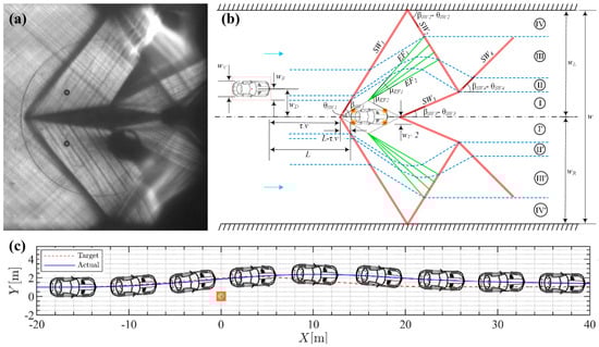 Thereafter, the specific case of a sudden stationary obstacle appearing ahead of the following vehicle has been solved, using the fundamental principles of supersonic compressible flow, leading to a path-planning algorithm for the purpose of collision avoidance. Figure 1a,b shows the accuracy and correspondence of the analogy in the actual fluid flow field and that of the vehicular traffic.