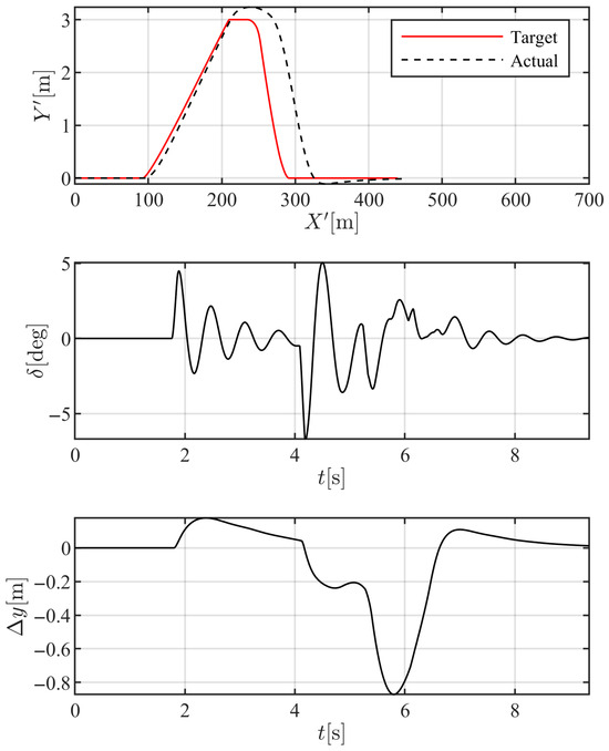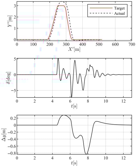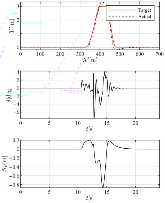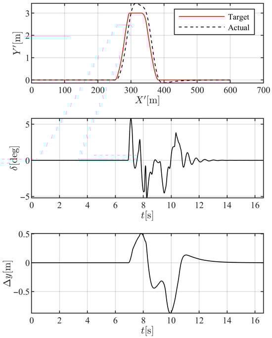It should be noted that the 3-DOF model described in Equation (17) is used solely to formulate the error dynamics and derive the control law. All validation simulations in this study are conducted using the more sophisticated and previously validated 7-DOF vehicle model, which is detailed later in the manuscript.