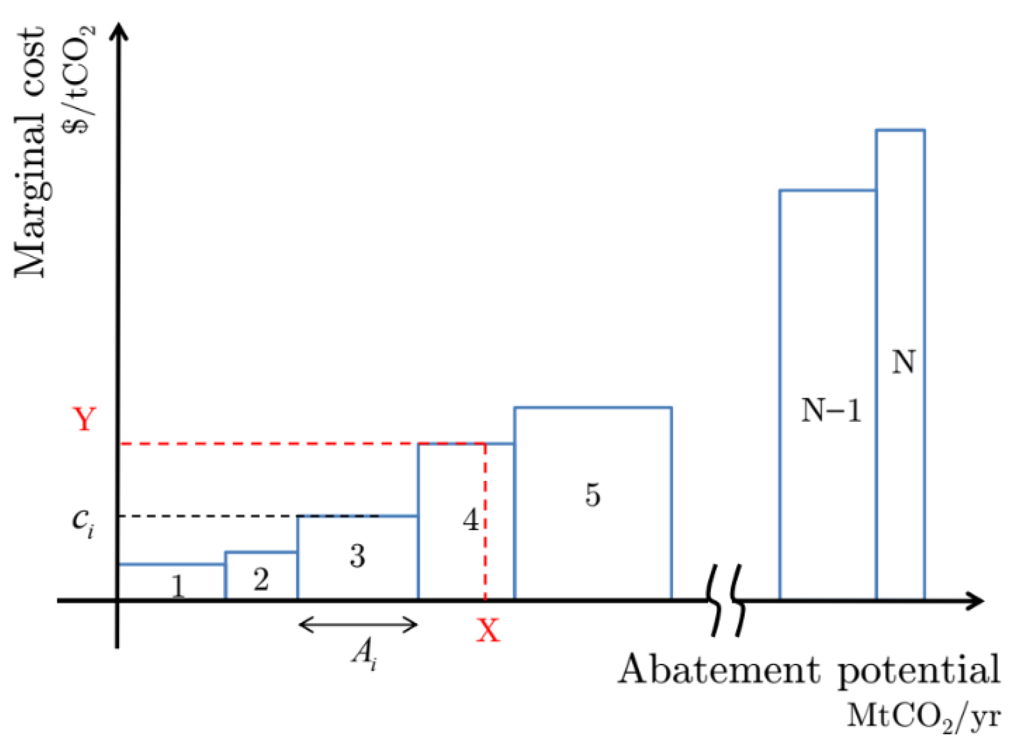 Graphically represented by a step graph, the MAC curve is built by applying N GHG mitigation measures, with each step corresponding to a specific measure. The curve illustrates the Marginal Abatement Cost in $/tCO2(e) (Y-axis) versus the potential for emission reduction in MtCO2(e)/year (X-axis). Figure 1 illustrates a graphical representation of the MAC curve.