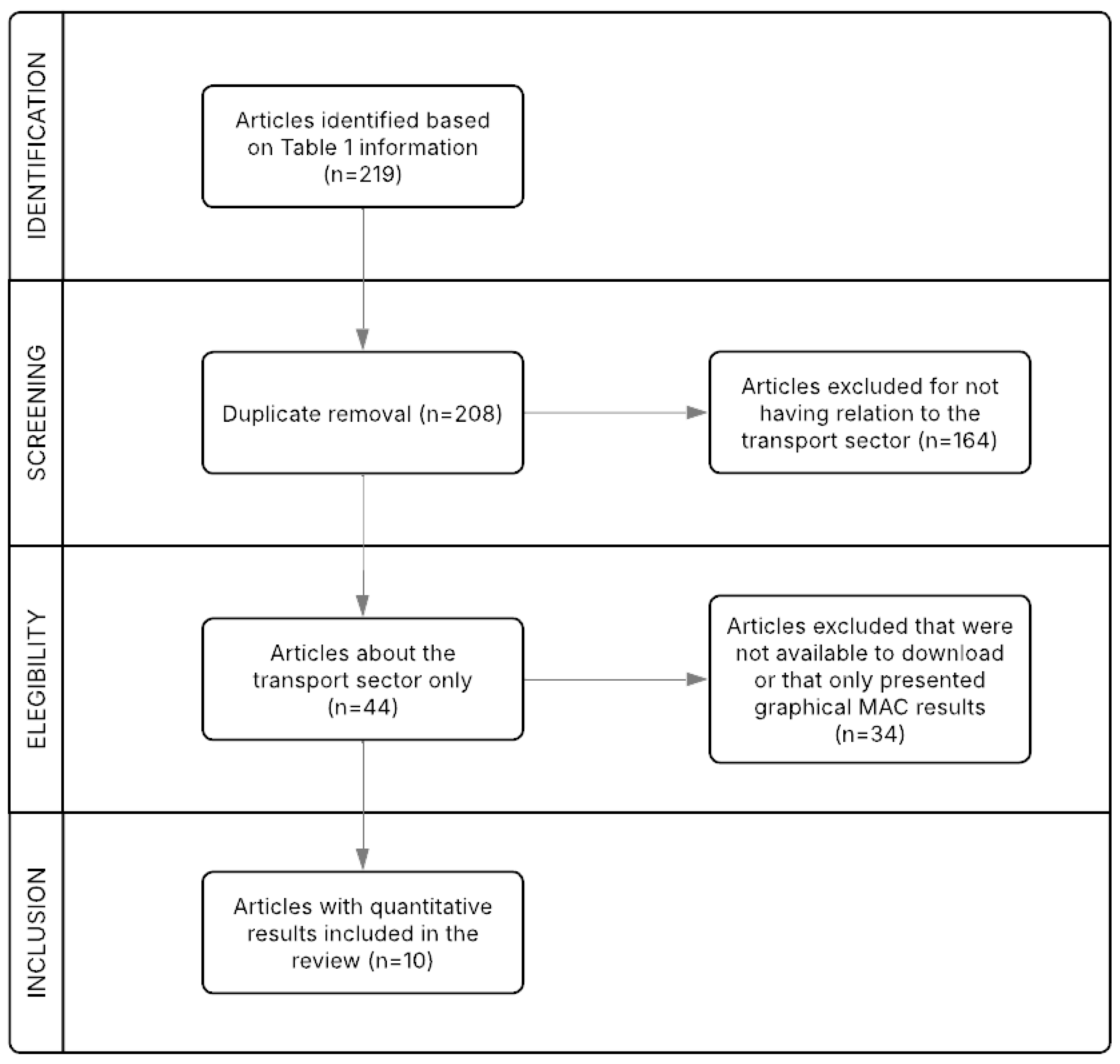 From the 219 resulting articles, a primary screening step removed duplicate articles, yielding 208 unique articles. A second screening step then selected articles exclusively focusing on applications in the transport sector; their titles and abstracts were analyzed, removing 164 articles and narrowing the results to 44. From these, the full articles, that were accessible via download, were analyzed to determine whether they provided values for the abatement potential and cost for each mitigation measure. This eliminated articles that only graphically expressed the MAC curve, resulting in 10 articles selected for further analysis that featured a quantitative calculation of the MAC curve, allowing for a comparative analysis of abatement costs and reduction potential, which is a central objective of this study. Figure 2 provides a workflow of the article selection process.