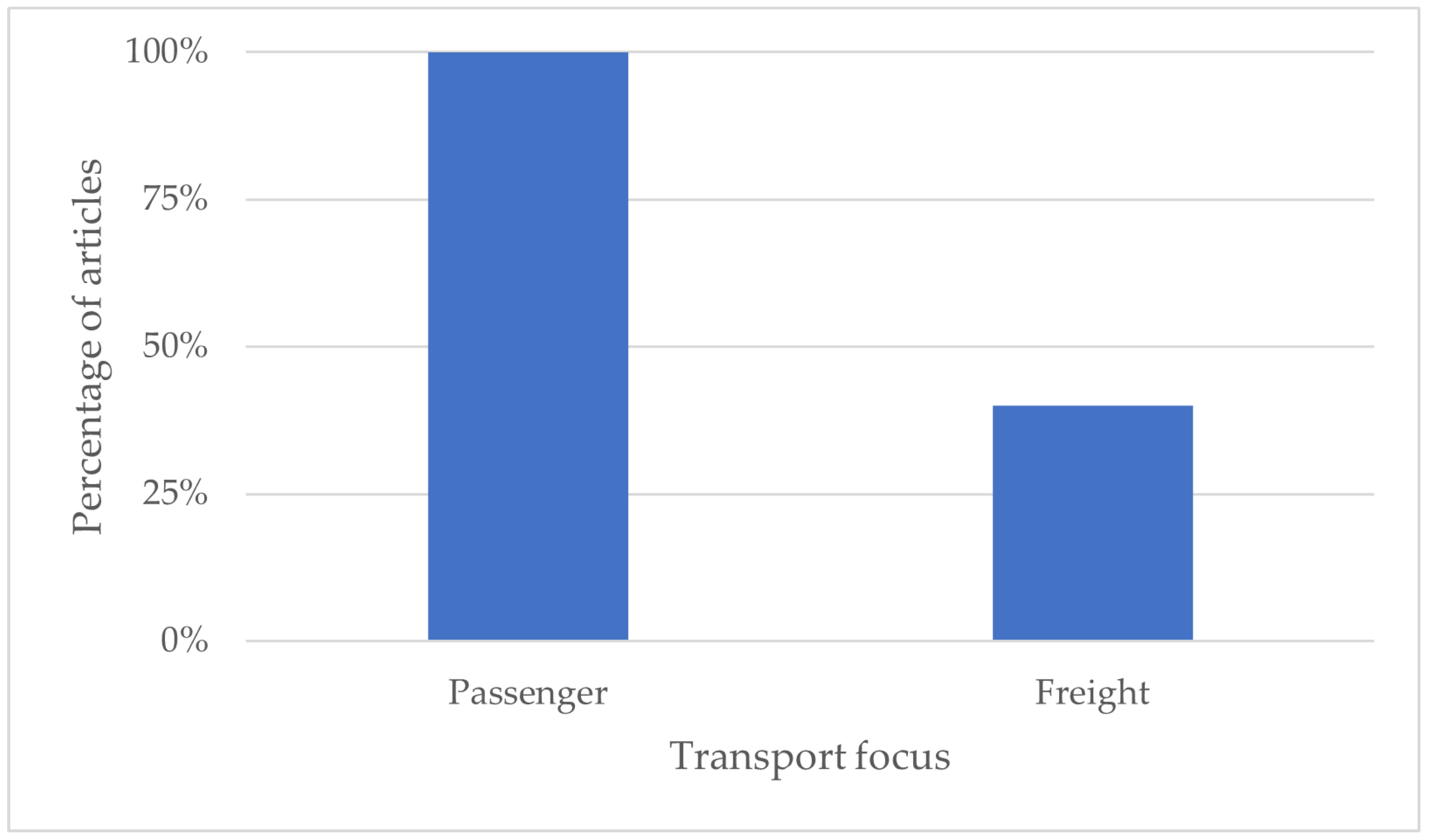 All of the studies address passenger transport, relegating freight transport to the background (Figure 3), with freight being studied alongside passenger transport. None of the studies focus solely on freight transport.
