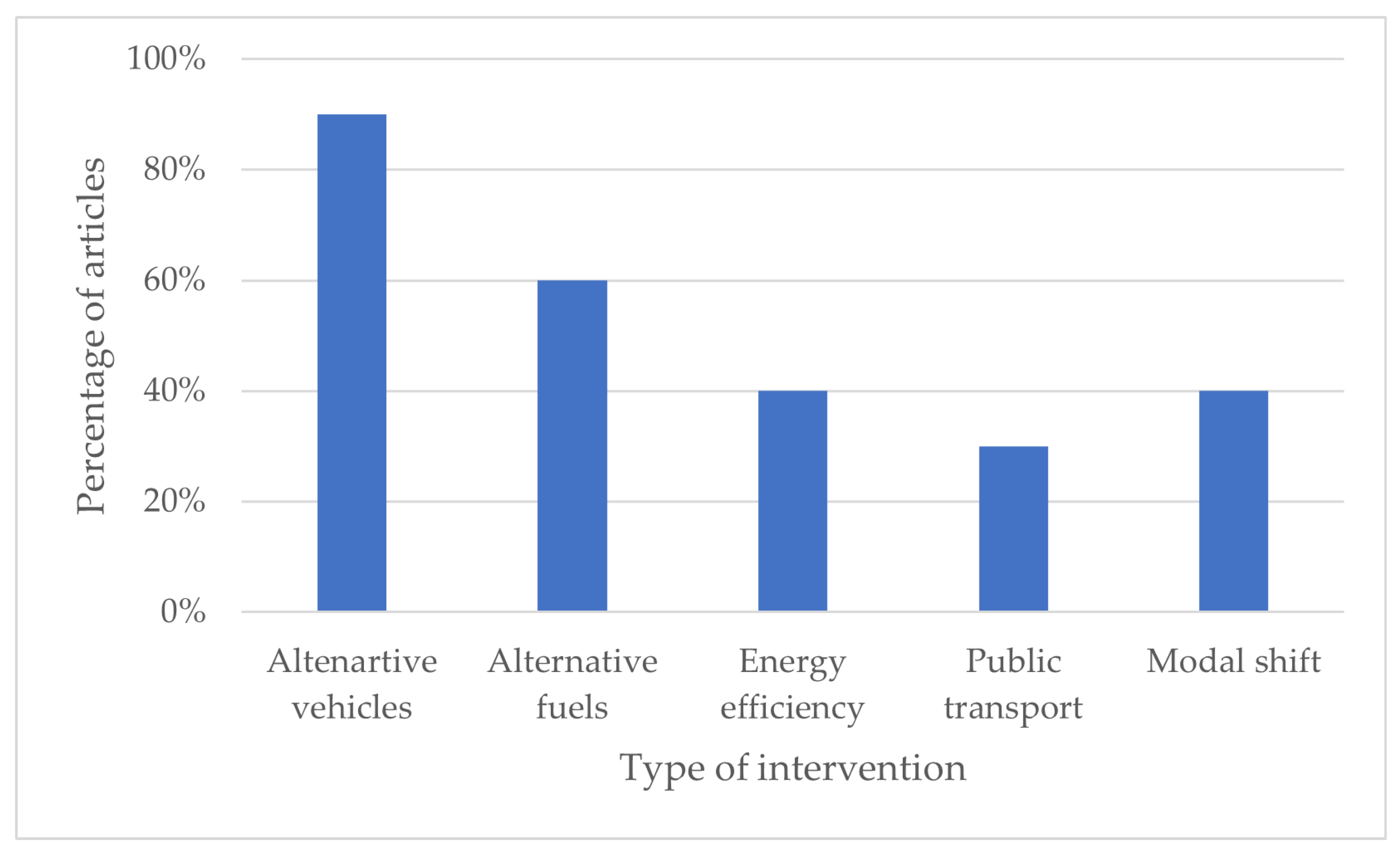 A modal shift intervention is often associated with freight transport, as seen in Table 2, where three [12,18,21] of the four studies that addressed freight transport had this type of intervention. Most of the interventions focused on the implementation of alternative vehicles and alternative fuels, as shown in Figure 4, which presents graphically the results from Table 2.