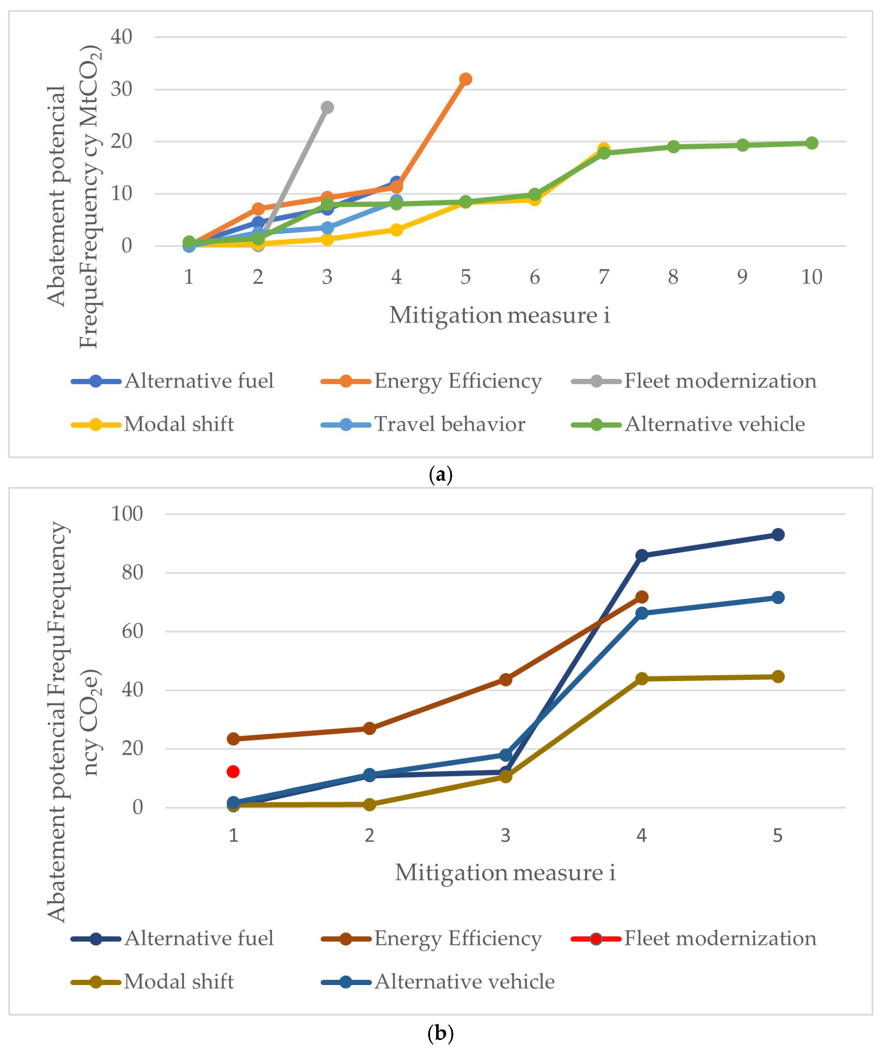 Based on Figure 5, the implementation of alternative fuels was the measure with the greatest range of abatement, followed by alternative vehicles, demonstrating how the technological advancement associated with the use of renewable energy could have a greater abatement potential.