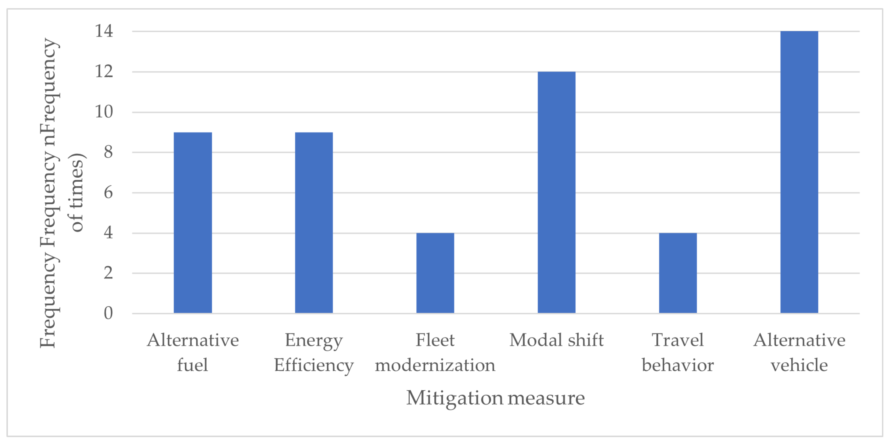 In order to allow for comparison between the studies, which use varying terminology, the names of the mitigation measures were standardized into categories based on their technical purpose. For the standardization process, six groups of mitigation measures were created, named as follows: alternative fuels; alternative vehicles; energy efficiency; fleet modernization; modal shift; and travel behavior. The resulting standardization is presented in Table A1 of Appendix A.