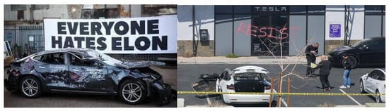 - Cooper, J.; Johnson, G. Violent Attacks on Tesla Dealerships Spike as Musk Take Prominent Role in Trump White House. AP News, 19 March 2025. Available online: https://apnews.com/article/tesla-vandalism-musk-trump-domestic-extremism-7576c03393a733eaf34b793e86ad1a6f (accessed on 20 June 2025).