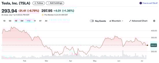Elon Musk’s political career in the Trump administration caused significant damage to Tesla Inc. (Austin, TX, USA). A survey in 2024 showed that Tesla buyers do care about what Musk is doing; a notable 43% of those familiar with both Musk and Tesla report that their opinion of Musk has some influence on their sentiment toward the Tesla brand [8]. While being busy shaping the globe’s future [9], Musk faced serious troubles with his flagship e-vehicle company. As the following chart shows in Figure 2, in fiscal year 2025 (status as on 7 July 2025), the first quarter was catastrophic for Tesla, and the stock market prices started to rise only after Elon Musk left the Trump administration on 28 April 2025 [10].