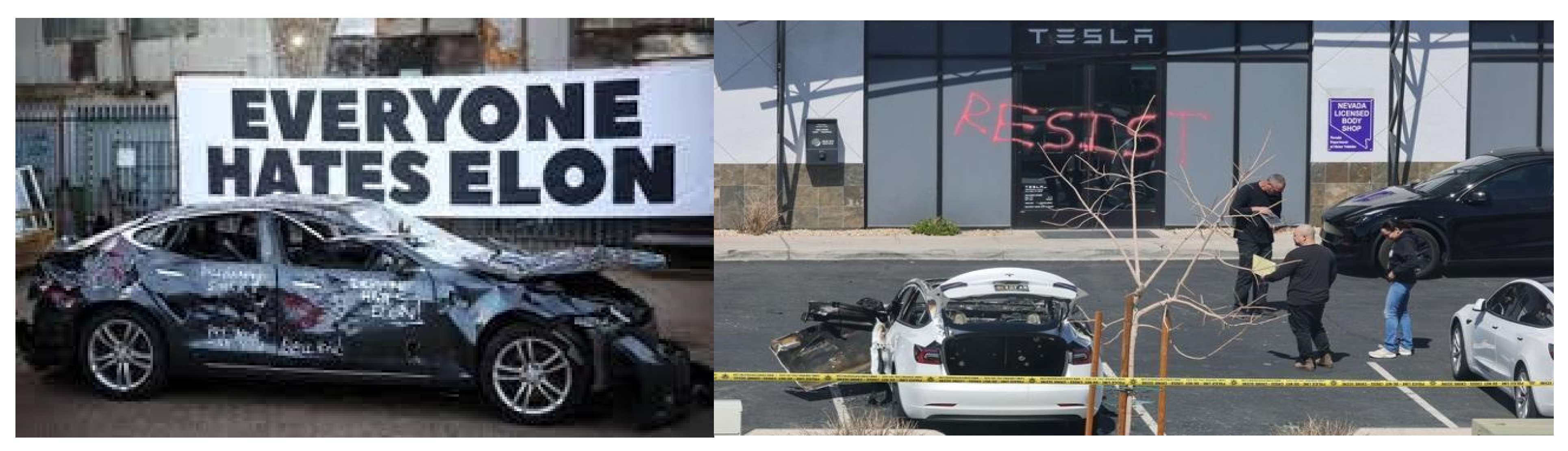 14]. Scapegoating in the social psychology literature involves blaming a vulnerable, typically minority, out-group for problems they did not cause. In our case, the frustration caused by the political maneuvers of Elon Musk has been channeled to non-defending objects, like cars, e-chargers, and shops. Their demolition provided a simple solution for a complex problem (also known as public administration and federal budget) and an outlet for pent-up frustration.