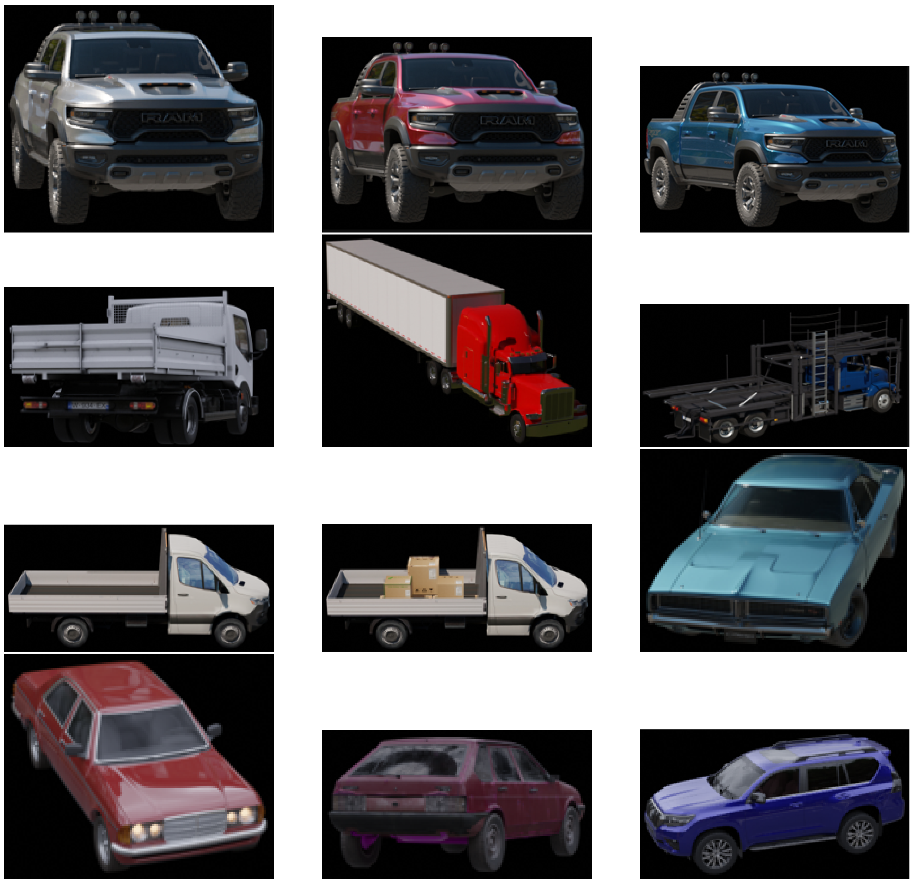 To diversify our training data, we created a large dataset of both real and synthetic vehicle images with varied vehicle types and camera perspectives. We rendered synthetic high-resolution photorealistic vehicular images using a custom rendering pipeline. The generated images span diverse conditions of lighting, elevation angles, and camera positions. Examples of synthetic images generated by our software are shown in