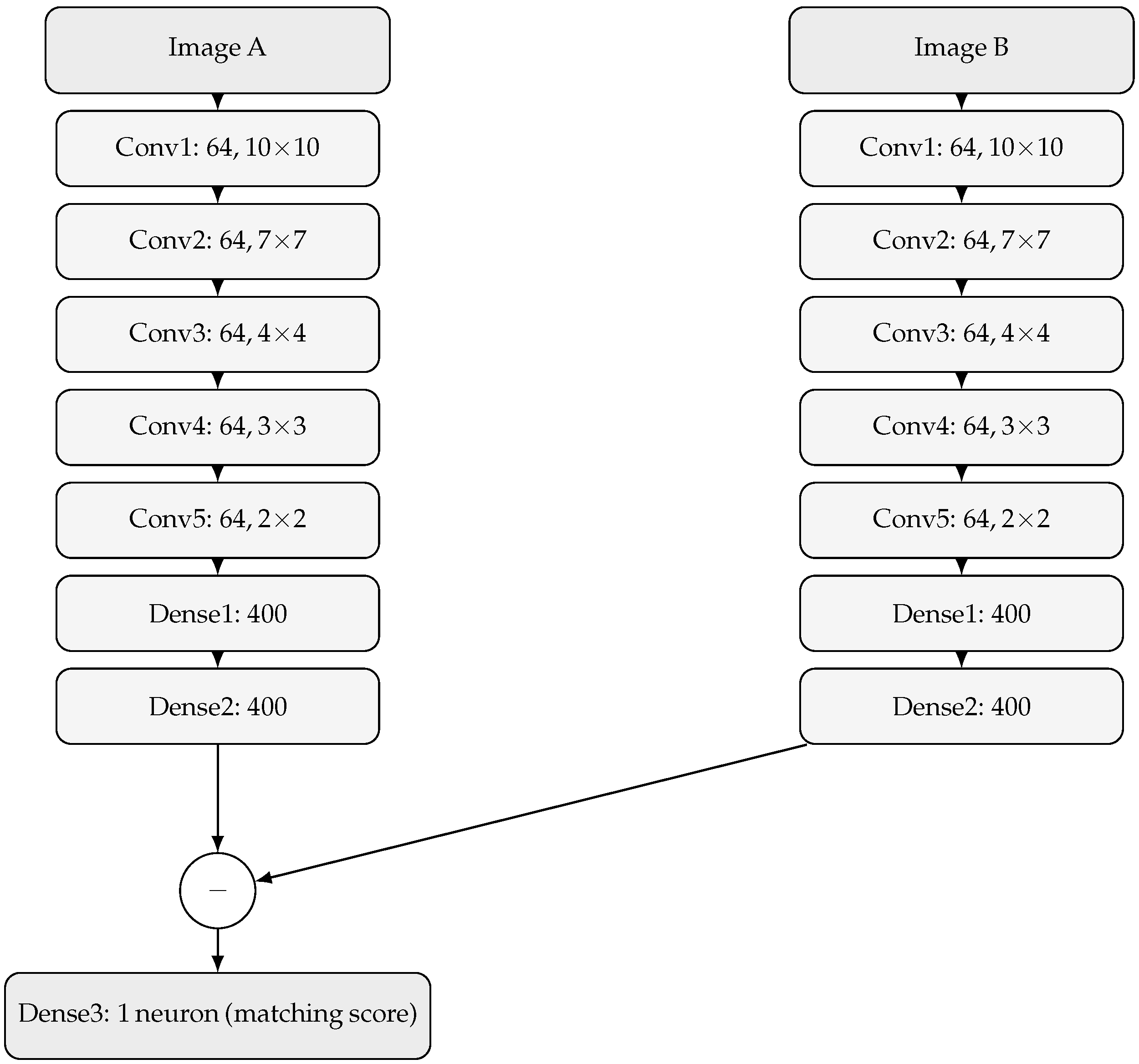 As noted earlier in this work, our framework adopts a Siamese architecture. The multiview matching network consists of seven layers: five convolutional layers followed by two dense layers. The first convolutional layer uses 64 filters of size 10 × 10, the second uses 64 filters of size 7 × 7, the third uses 64 filters of size 4 × 4, the fourth uses 64 filters of size 3 × 3, and the fifth uses 64 filters of size 2 × 2. Each convolutional layer is followed by a max-pooling operation and batch normalization. The output of the fifth convolutional layer is flattened and passed to the two consecutive dense layers. Each dense layer contains 400 neurons with a sigmoid activation function. The outputs of the second dense layers from both branches are subtracted and passed to a final single-neuron dense layer that computes the similarity score. The structure of each branch is listed in