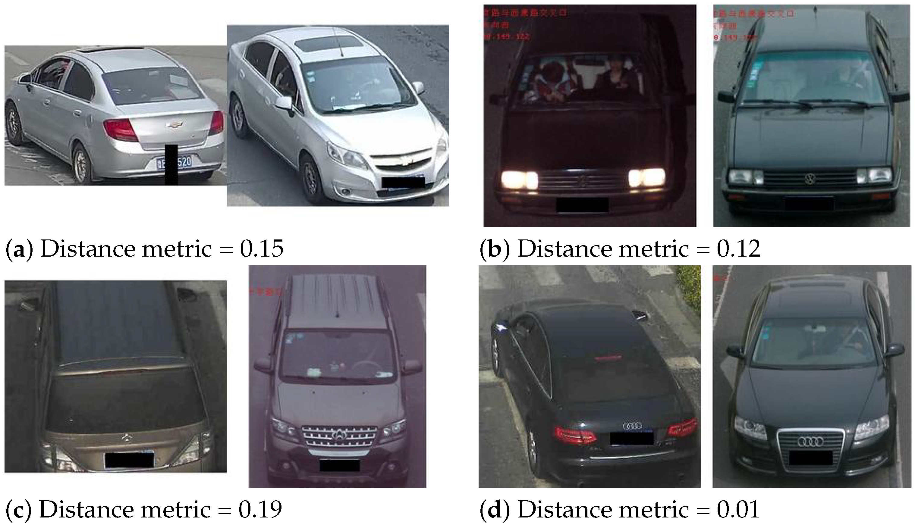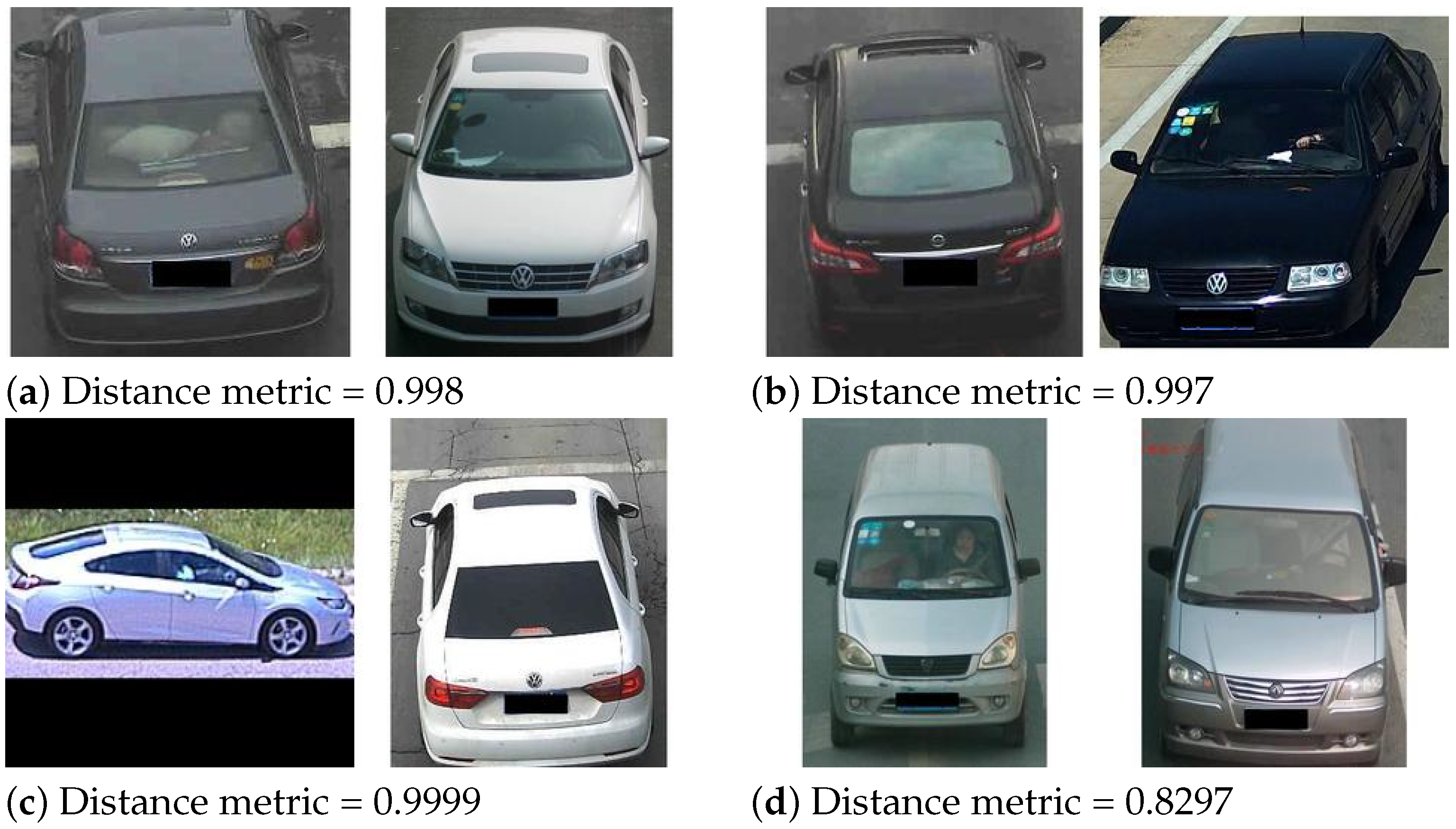 Figure 11a,b) or by vehicles that share nearly identical visual characteristics such as make, model, and color (