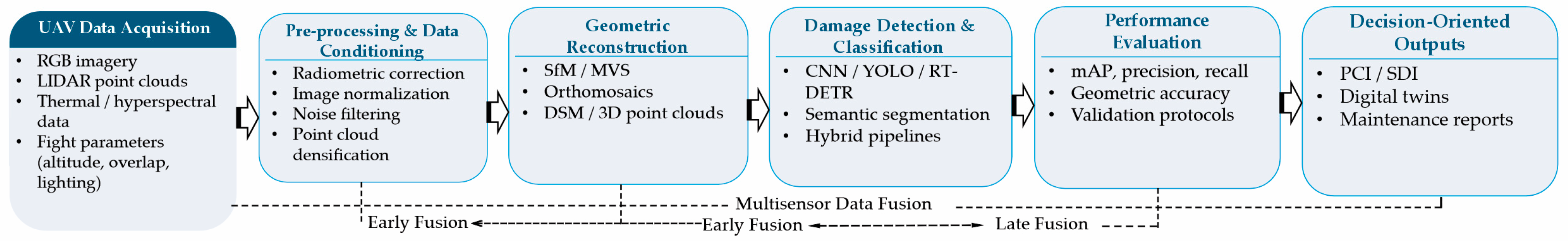 | Fakhri et al. [11]/Iran | Photogrammetry with UAV applied to the detection of cracks in pavements; orthophoto generation and feature extraction | Supervised classification based on Decision Tree (DT) | RGB images acquired with Phantom 4 Pro and Mavic Pro drones; orthophotomosaics generated from aerial imagery | Longitudinal, transverse, oblique, block and alligator-type cracks | Overall accuracy 96% in orthophoto at 20 m; accuracy between 82% and 91% in test orthophotos; Kappa index 96%; F1-score 88% | High precision at low altitude; non-destructive process; wide coverage without interrupting traffic; lower cost compared to laser systems; suitable for recurrent inspections | Influence of shadows and lighting; it depends on flight parameters such as height and resolution; requires intensive processing for segmentation; the DT model can be limited in complex scenarios | Can be integrated with CNN or SVM to improve robustness; potential combination with LiDAR or thermal cameras; applicable in multi-sensor platforms; useful for powering digital twins and predictive systems |