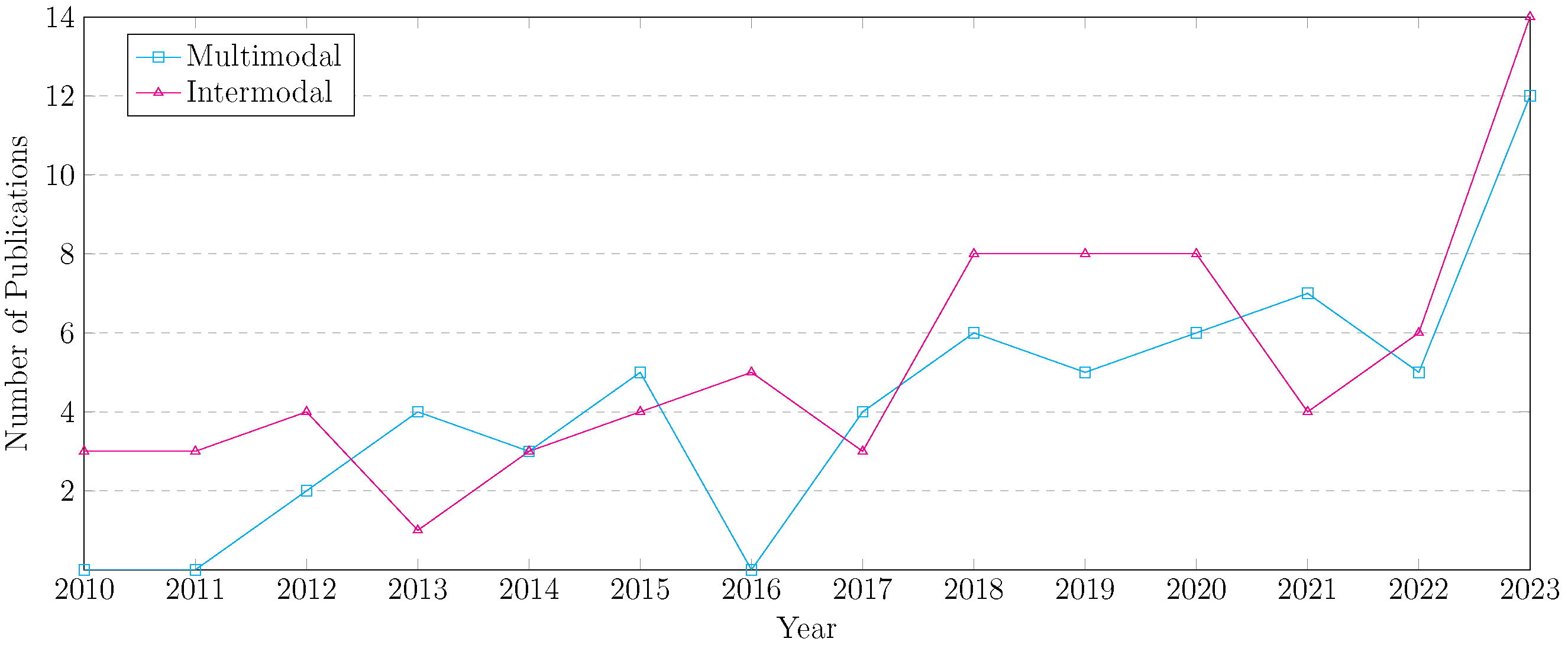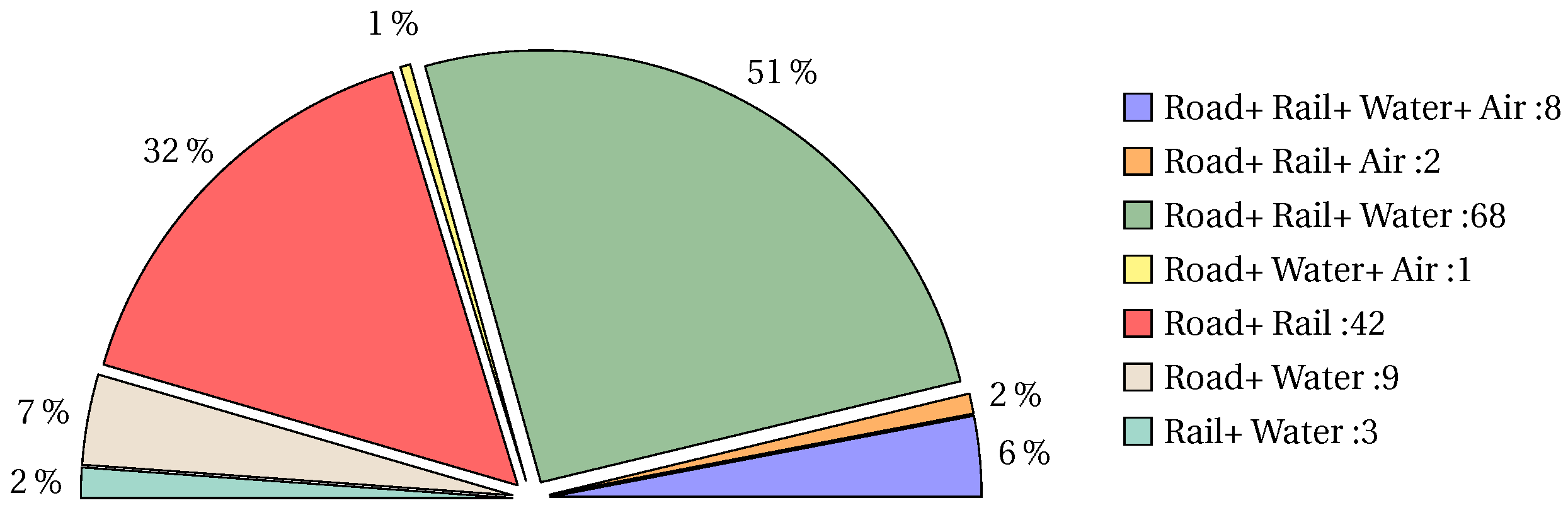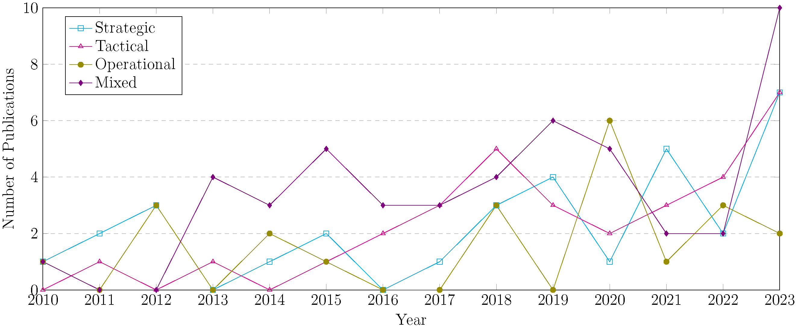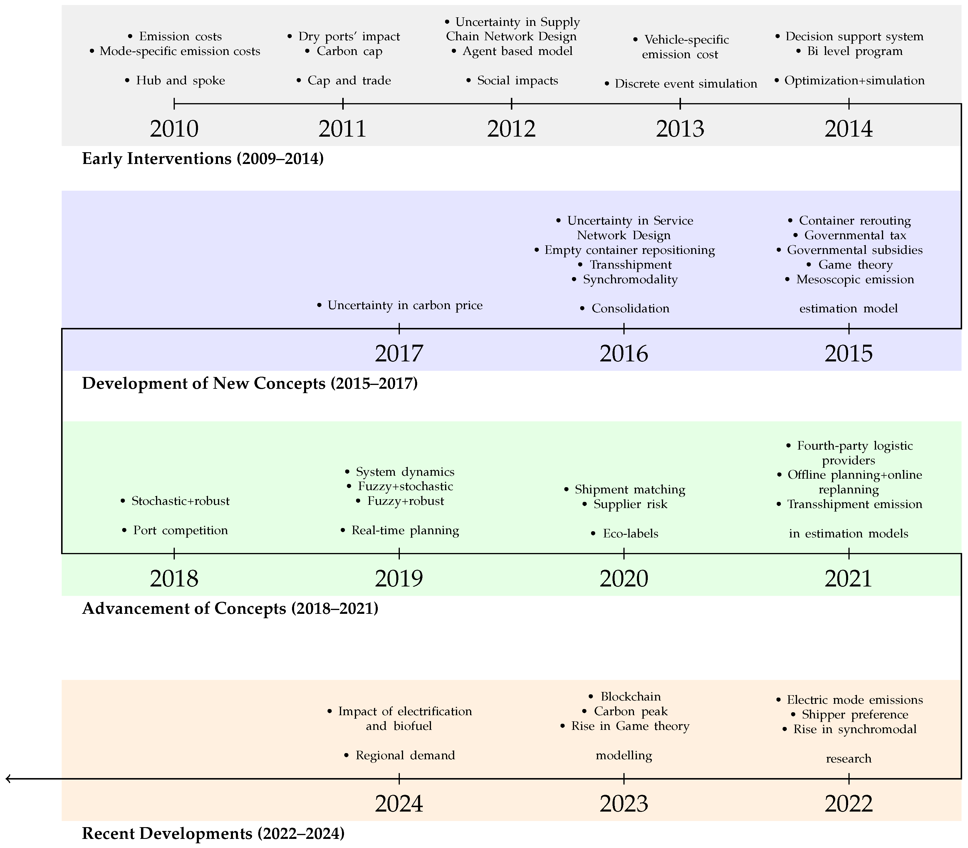 | 2022 | Electric mode emissions [91]; Shipper preference [123]; Rise in synchromodal research [121,123,125] |