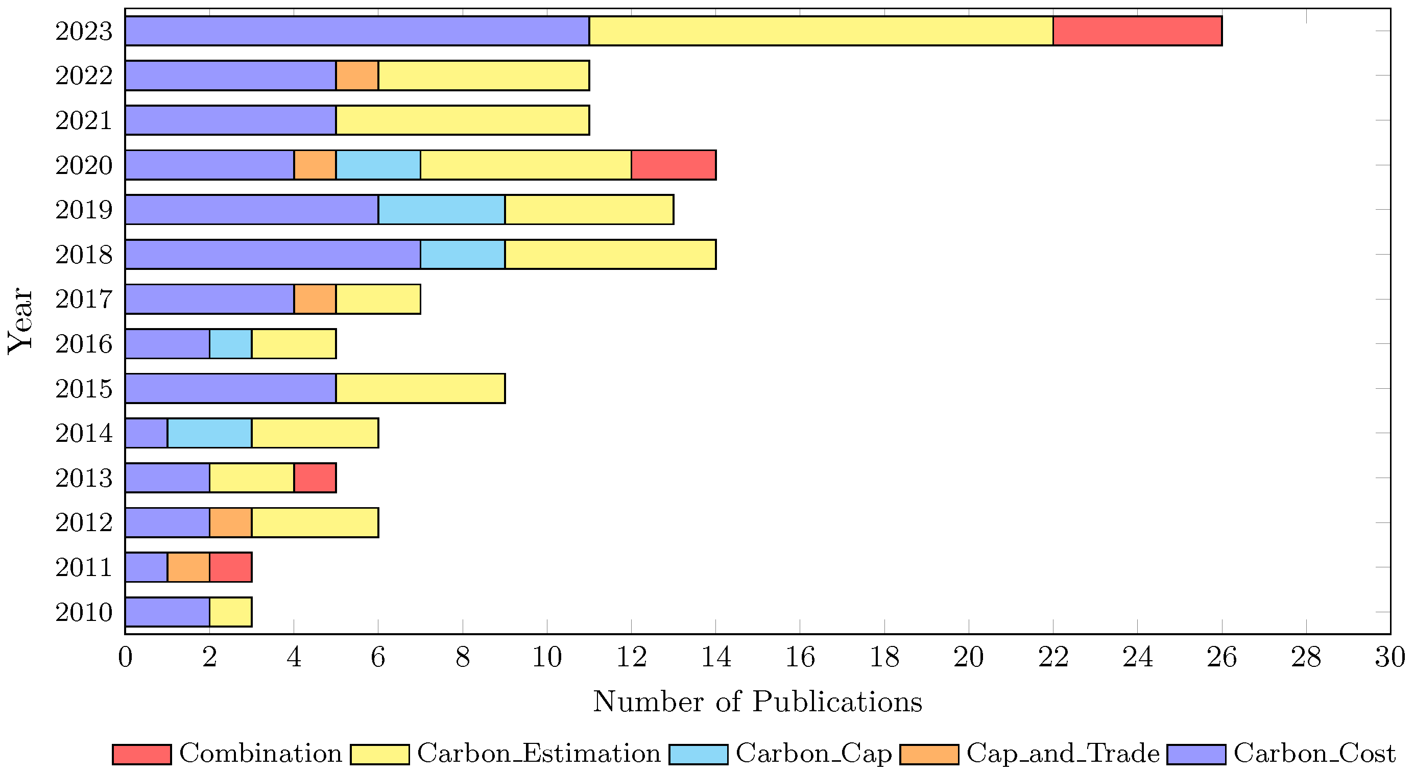 | 2023 | Blockchain [126]; Carbon peak [134]; Rise in Game theory modelling [127,128,129] |