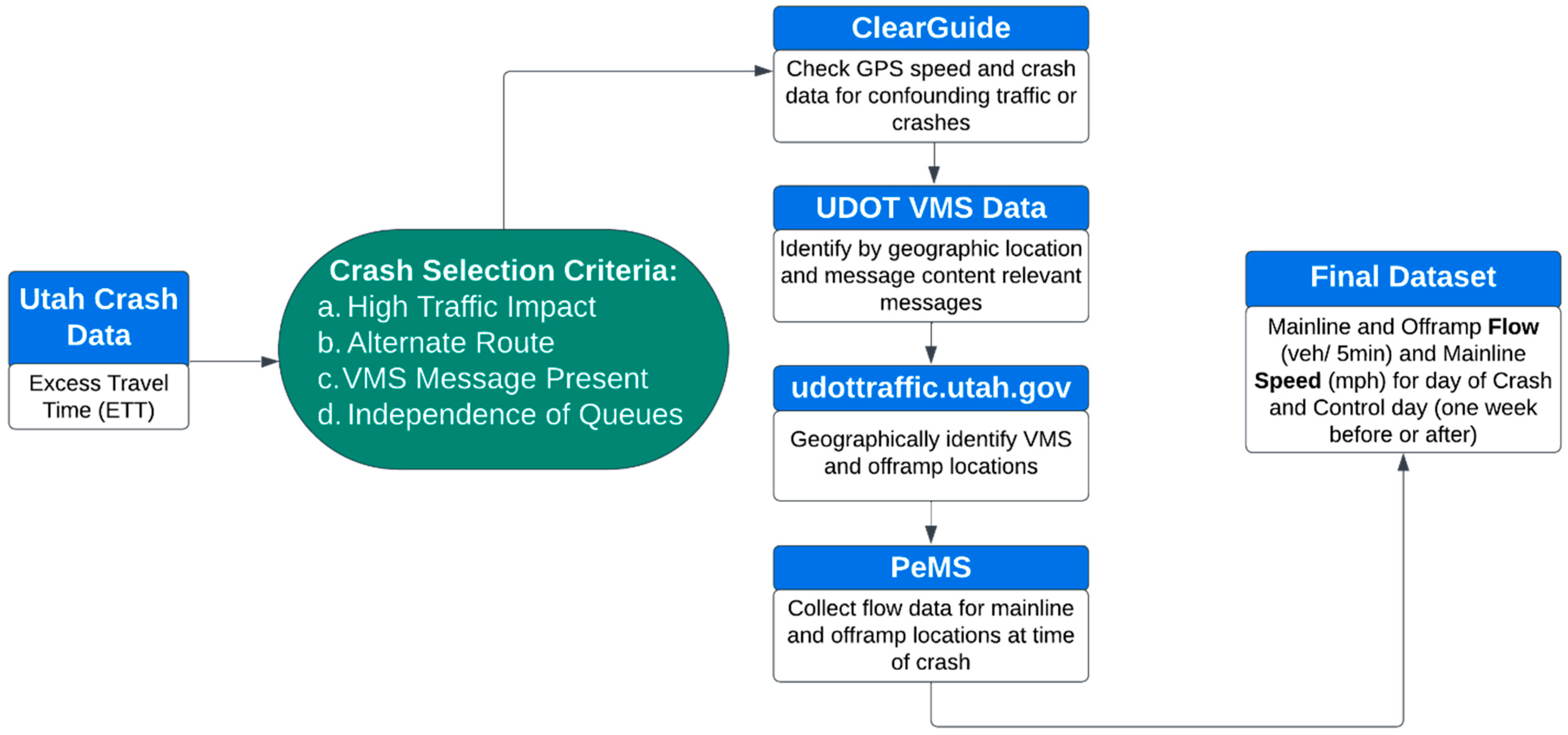 - The crash needed to have a high ETT. A higher ETT was theorized to correlate with a larger number of drivers impacted, longer queues, a higher potential for drivers to divert, and more freeway offramps available for analysis. While a high ETT threshold was not quantified, crashes were sorted by ETT and those with the highest ETT were evaluated first.