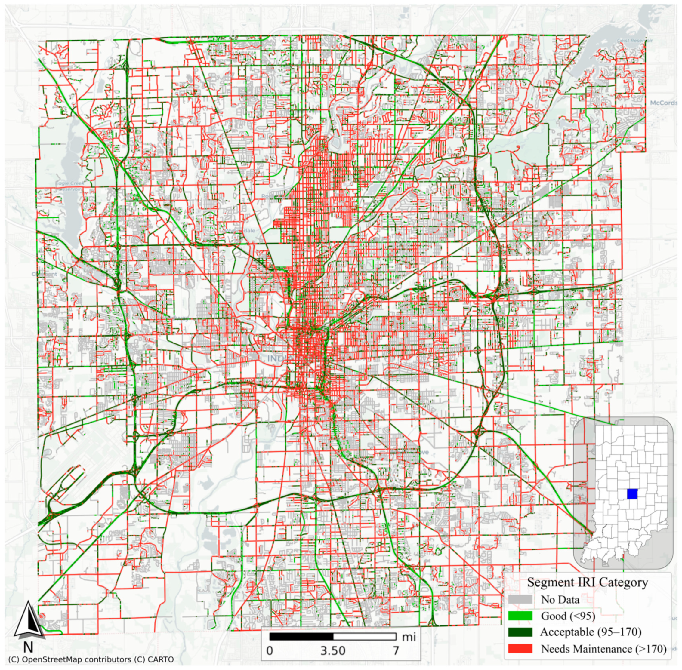 - Indiana Local Road and Bridge Report. Purdue University Local Technical Assistance Program; Purdue University: West Lafayette, IN, USA, 2024. Available online: https://www.purdue.edu/inltap/resources/2024-08-20-Indiana-Local-Road-and-Bridge-Report---FINAL.pdf (accessed on 16 July 2025).