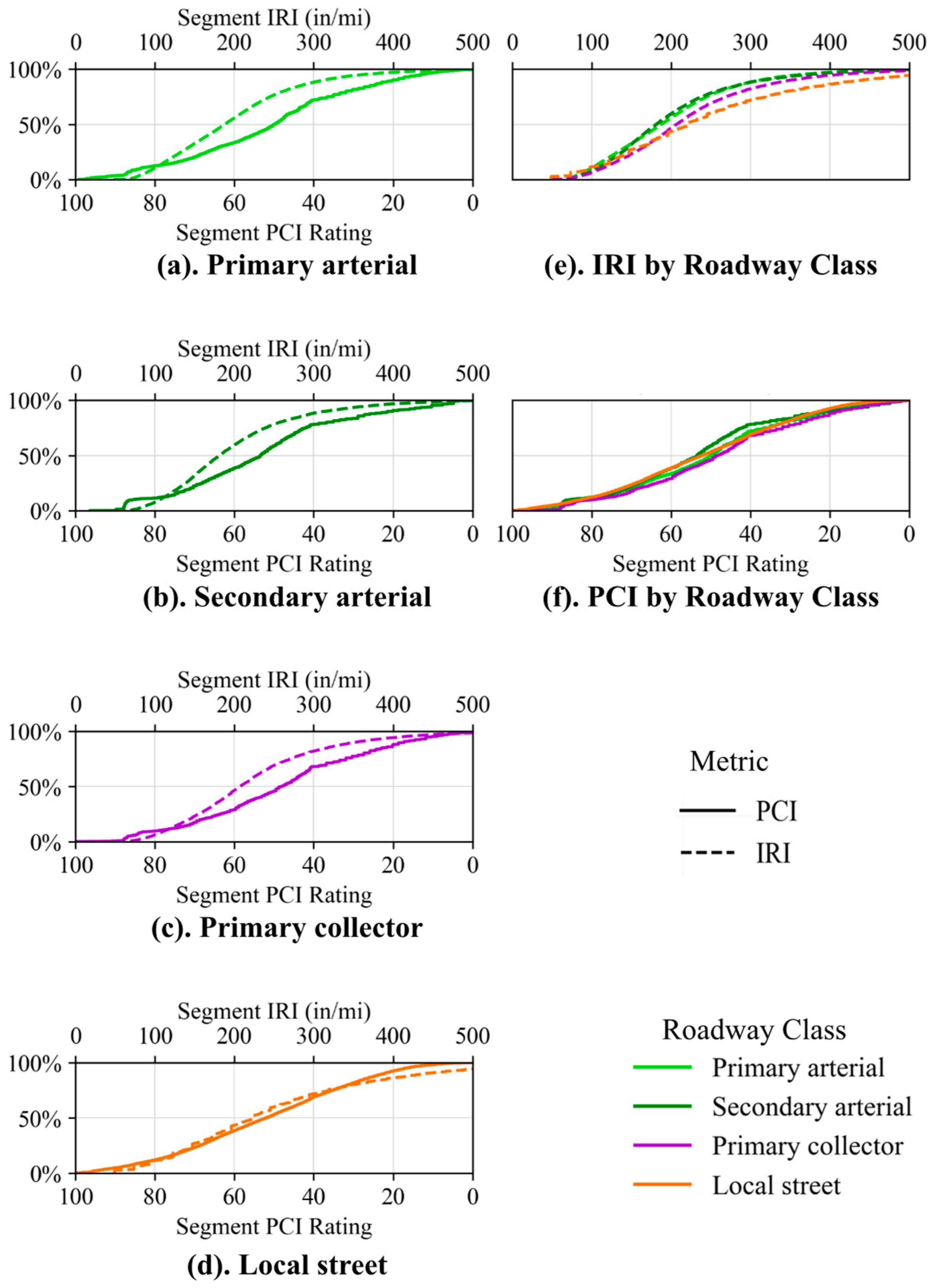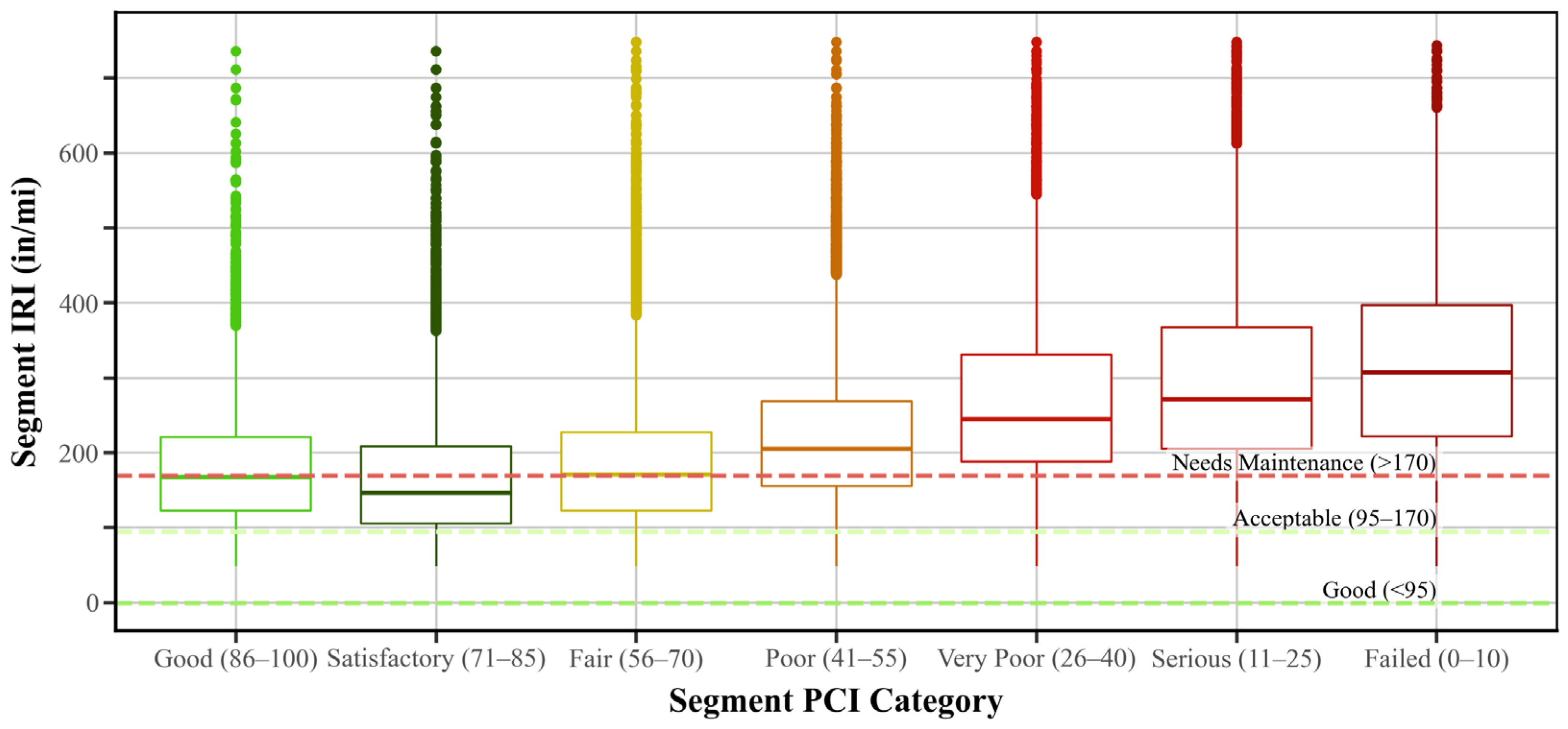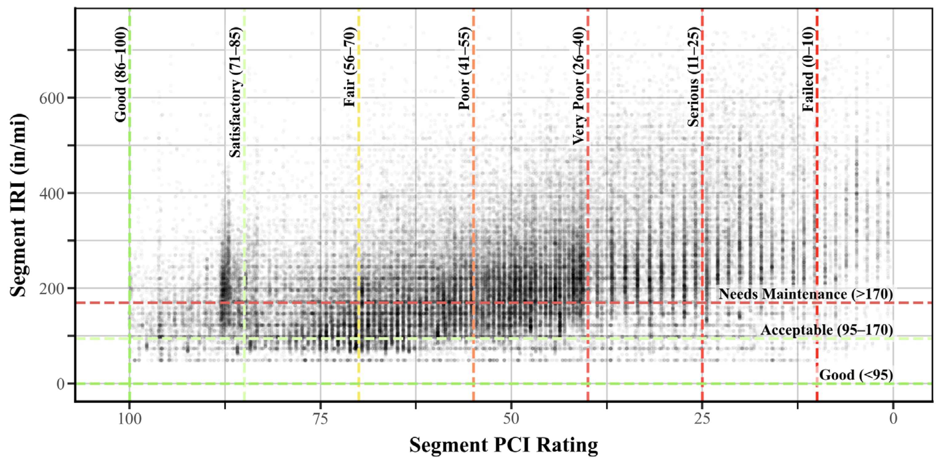 - Systematic biases were observed in both metrics. For instance, a high false-negative rate for PCI values around 87 indicated possible category bias in the dataset (Figure 11), and these segments can be re-evaluated according to the ASTM standards to correct for it if needed. Therefore, agencies can mitigate problems from biased data by combining both metrics: using IRI for large-scale screening and quality control and relying on PCI for diagnosis and treatment planning due to its ability to account for distress type and severity.