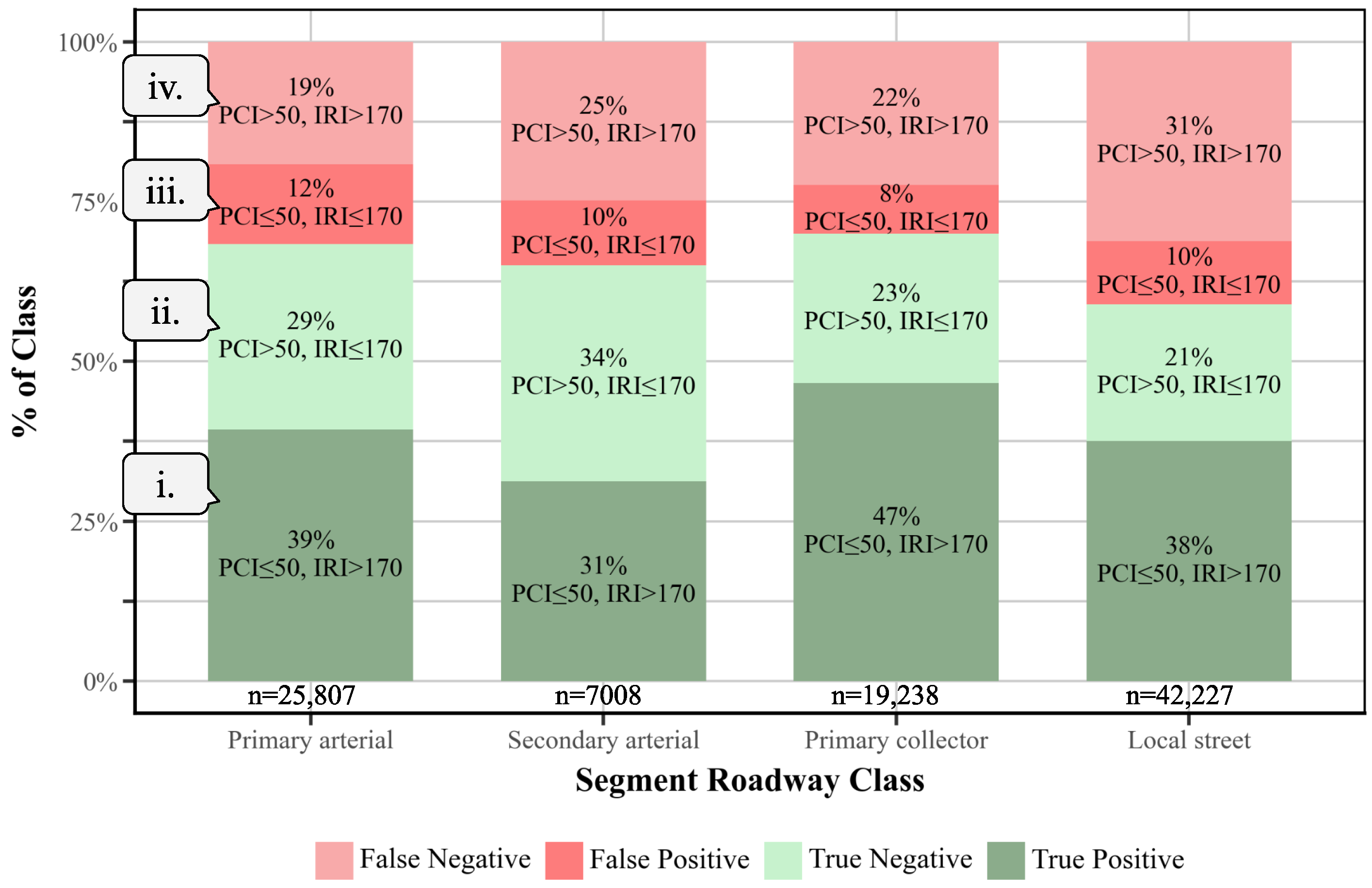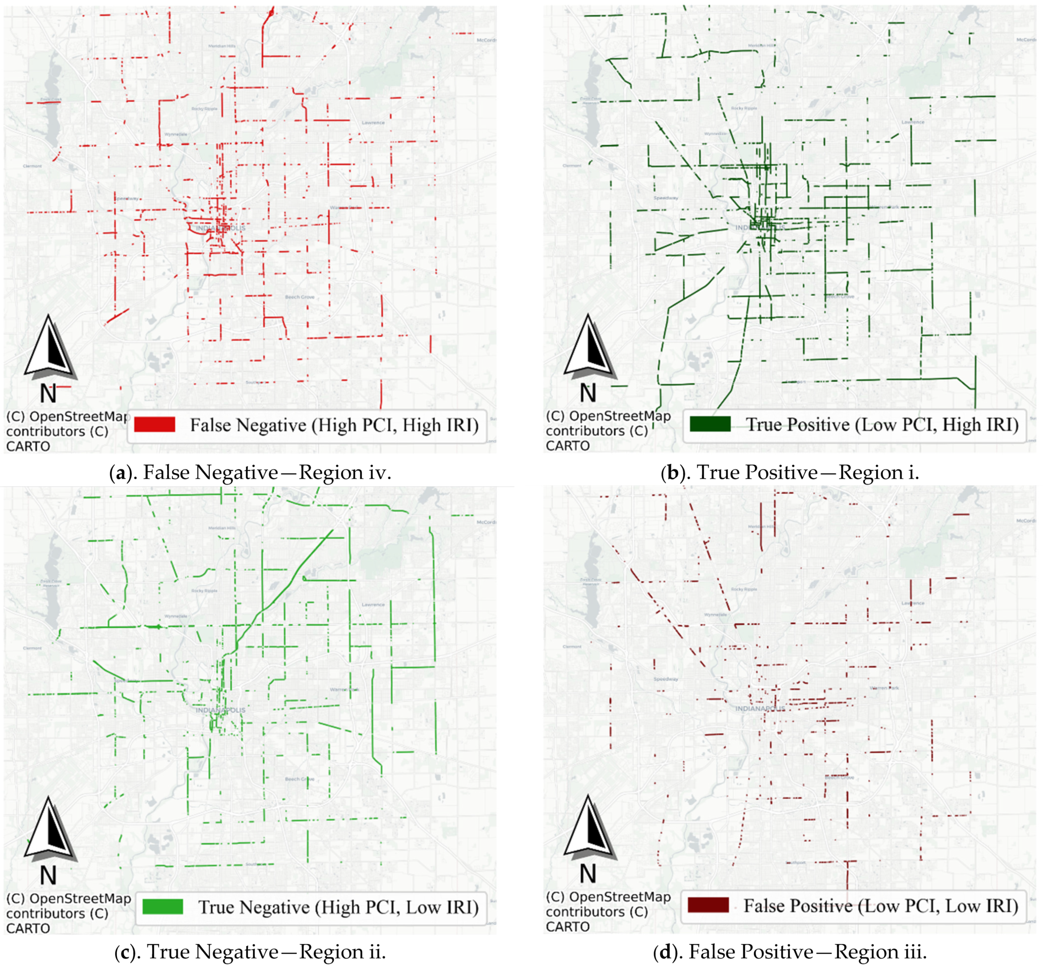 - False Negative (FN): PCI suggests good condition, but IRI indicates a rough surface.