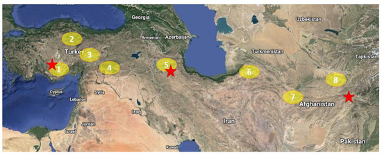 Countries and provinces from which WLR were collected (Turkey: 1-Konya, 2-Tokat, 3-Malatya, 4-Mardin; Iran: 5-East Azerbaijan, 6-North Khorasan; Afghanistan: 7-Herat; 8-Balkh) and the sites where field trails were conducted (Konya, Turkey; Maragheh, Iran, Kabul, Afghanistan).