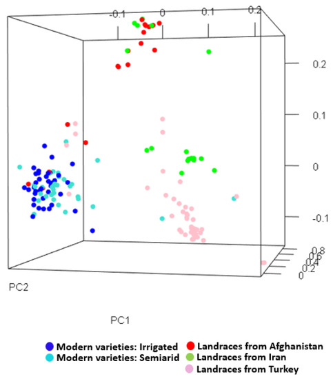 All the materials were genotyped using a high density Illumina Infinium 25K wheat SNP (Single-nucleotide polymorphism) array (TraitGenetics GmbH, Gatersleben, Germany). A filtered set of 15,208 SNPs having missing data <20% and minor allele frequency ≥5% were included in the analyses. To estimate the number of subgroups, principal components analysis (PCA) was performed in R package “stats” and a 3D view of the PCA was drawn using the R package “rgl”. Polymorphic information content (PIC) [14] was used to estimate total diversity and compare different subpopulations observed in the PCA analysis using a custom R script.