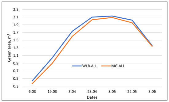 The dynamics of green area (m2) changes for wheat landraces and modern germplasm at seven dates in 2019, Konya, Turkey.