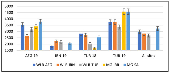 Grain yield mean values for the three sites for two years are presented in Table 1 and for individual locations in Figure 4 and Table S5. Overall, the MG outyielded the WLR by 10% with average yields of 3.41 and 3.01 t/ha, respectively. However, Afghan landraces were as high yielding as was MG in Afghanistan in 2019. There was no significant difference between WLR and MG in Iran in 2019. Afghan and Iranian landraces had significantly higher yields than did both MG groups under severe drought in Turkey in 2018. Abundant moisture in Turkey in 2019 clearly favored the MG. Among three WLR groups, the Afghan material was the highest yielding followed by those from Iran and Turkey.
