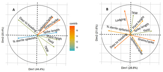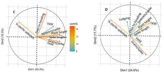 The relationship between grain yield, its components, and other traits was evaluated using PCR biplot analysis of trial results from Turkey in two contrasting seasons: drought-affected 2018 and favorable 2019 (Figure 5). The biplots for all WLR demonstrated a diverse structure of the relationship among traits. In both years, grain yield was negatively related to the number of days to heading and spike sterility and positively to plant height. In 2018, 1000 kernel weight (TKW) was more closely associated with yield, whereas in 2019 the number of grains per spike had a higher contribution to grain yield. The same biplots for MG were much more “coordinated” and one-dimensional. Independently of the year, the grain yield was negatively correlated with spike sterility and positively with the number of grains per spike. TKW association with yield was higher in 2018. The main difference between two groups of material was the negative effect of earliness (number of days to heading) on grain yield in WLR, whereas this trait was less important for productivity contribution in MG. This is likely due to the lateness and relatively low yield of Turkish WLR. The structure of the relationship between agronomic and adaptation traits is important for designing the crossing and selection methodology to maximize grain yield.