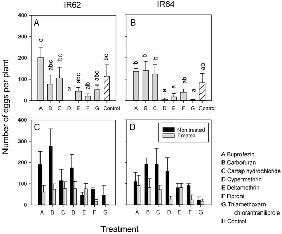 Results from multichoice (A,B) and binary choice (C,D) bioassays conducted in the greenhouse. Bioassays were conducted separately for IR62 (A,C) and IR64 (B,D). Plants were treated with one of seven insecticides (A to G) as identified in the legend. Control plants were sprayed with water. Error bars are presented (N = 5 for (A,B), N = 3 for (C,D)). Lowercase letters (a–c) indicate homogenous treatment groups (Tukey p < 0.05).