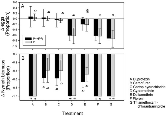 Estimated combined effects of HPR and insecticide (P + HPR: black bars) and estimated pesticide effect alone (P: grey bars) on (A) egg laying, and (B) nymph biomass in greenhouse bioassays. Effects are indicated as proportional changes in fitness parameters compared to untreated IR64. Negative numbers indicate reduced fitness. Standard errors are indicated (N = 5). Lowercase letters (a,b) indicated homogenous treatment groups based on Tukey pairwise comparisons (p < 0.05) (see also Table 1).