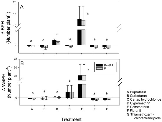 Estimated combined effects of HPR and insecticide (P + HPR: black bars) and estimated pesticide effect alone (P: grey bars) on (A) BPH densities, and (B) WBPH densities on IR62 in the screenhouse. Effects are indicated as proportional changes in planthopper densities compared to untreated IR64. Negative numbers indicate reduced densities, positive numbers are increased densities. Standard errors are indicated (N = 5). Lowercase letters (a,b) indicate homogenous treatment groups based on Tukey pairwise comparisons (p < 0.05) (see also Table 2).