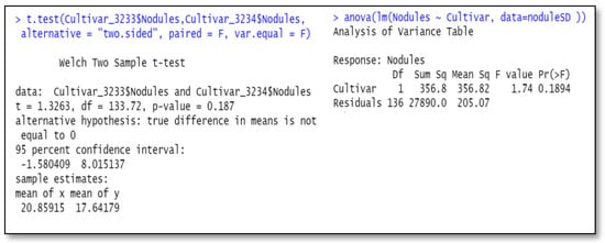Over-simplified analyses can give misleading first impressions. A researcher had requested a simple independent-sample t-test for cultivar difference. An issue with this test is that the p-value for cultivar difference from this did not agree with probabilities from a linear model analysis-of-variance. The anova table of the nodule counts, using Equation (2), is shown in Table 1. This table has a cultivar null hypothesis probability of 0.026, which differed from the independent sample t-test with probability of 0.19. The independent-sample t-test for cultivar differences was shown to be equivalent to a one-factor (cultivar) anova (see Figure 1), as discussed in the literature review. This example illustrates that the independent sample t-test comparing cultivars, because it does not take account of important sources of variation, inflates the error term. These sources of variation include blocks (greenhouse runs) and inoculum treatments, which, when part of the residual, makes the error term too high for the independent sample t-test compared with the multi-factor anova model.