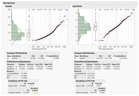 The data do not fit the usual anova assumptions. A third issue is that data are counts of nodules on the alfalfa roots, and count data do not usually follow a normal distribution. This leads first to the question of whether to transform the data to solve this issue. Later we also explore using generalized linear models (glm) for analysis. The square root (sqrt) transformation is recommended by Snedecor and Cochran to better approximate the NID anova assumptions ([], pp. 287–289). Data distributions for original data y and recommended transformation sqrt(y) are given in Figure 2 below. JMP graphically depicts the data distributions, including the original nodule count data and the square root of nodule count. Tests of goodness of fit for normal distributions are below the histograms and normal quantile plots, and the square-root transformation distribution does not significantly differ from the normal distribution.