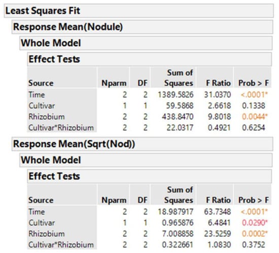 We know that taking averages of the eight plants per treatment combination results in means that are more normally distributed than the original count data. Analysis using averages of the original data is performed with Time (=block factor), cultivar, inoculum, and cultivar-inoculum interaction, given in Figure 3. The same analysis with the averages of square root-transformed nodule counts is also shown. These type analyses are called two-stage analyses []. From the output, we see two different estimates of probability of the null hypothesis that cultivars are equal, p = 0.029 for the averages of sqrt transformed and p = 0.134 for the averages of original data.