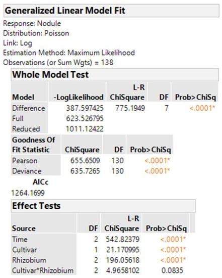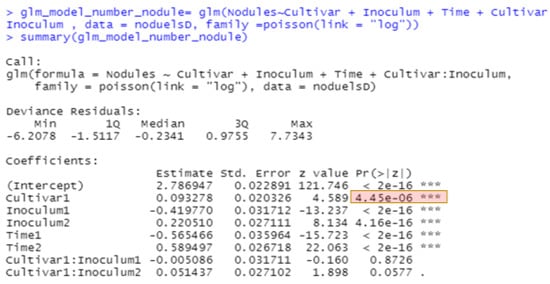 The best methods for analyzing non-normal data continue to evolve. The generalized linear model in JMP for nodule counts was modeled on fixed Time (greenhouse runs), Cultivar, Rhizobium inoculants, and Cultivar-Rhizobium interaction. This generalized linear model option is found in the upper right corner of the Fit Model window labeled “personality”. We use the Poisson distribution with log link and the output is presented in Figure 4. The same analysis in R using the function glm is shown in Figure 5, with the same probability for a test of cultivar differences, 0.000004. These figures indicate very high statistical significance, i.e., a low probability of cultivars having the same average counts of nodules, but this uses an error term with inflated degrees of freedom with the narrow inference restricted to the three fixed greenhouse runs (Times) of this experiment instead of the broader inference across future greenhouse environments. A correct error term for this broader inference uses the random time-cultivar interaction term as specified in expected values of mean squares in Table 1. With this term in the linear R model, we obtain a probability of 0.0259 for the test of cultivar differences, and in the glmm model in Equation (4) this probability is 0.0234 (see the R markdown file).