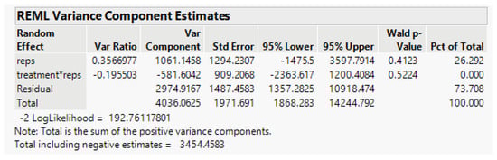By using the model in Equation (5) above, the random-effect variance component estimate (from JMP) for Treatment*Rep is estimated as 0, as shown (Figure 6) below.