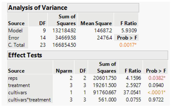 The desired inference requires a proper error term. The analysis of variance with fixed effects in Table 1 also has the problem that the test of cultivars uses a residual mean square based on 90 degrees of freedom (df), which is not the proper error term for inferring results to new greenhouse environments. Crawley ([], pp. 173–182) discusses considerations in random vs. fixed effects, and Stroup et al. ([], p. 10) discuss the scope of inference when making this choice in models. Plants are nested within each replication or greenhouse run (Time), and to infer results to future greenhouse conditions, we need to assume the greenhouse runs are a random sample from a population of such runs. The error needed for this broader inference should include the Time interaction with treatment combinations. This can be seen in the expected values of mean squares in the analysis of variance table, assuming a random Time-cultivar interaction. (Our example has the anomaly that the cultivar-block mean square is smaller than that of residual even though it is expected to be larger). The main issue is that the residual error term in Table 1 measures plant-to-plant variation, which has inflated degrees of freedom (df). Many researchers mistakenly use such error terms with degrees of freedom (df) higher than warranted by the experiment design, called pseudoreplication by Crawley ([], pp. 176–182). With mixed model analysis designating the block-treatment interactions as random, some software packages such as JMP automatically perform correct tests of treatment differences for broader inference.