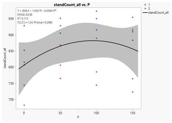 Quadratic regression line between the fertilizer levels and stand counts. The blue dots are from cultivar number 1, and the red ones are for cultivar number 2. The letter P in the equation is for the phosphorous rate in kg/ha.