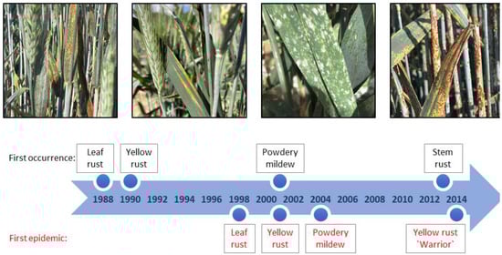 Triticale (×Triticosecale Wittmack) is the intergeneric hybrid generally resulting from a cross between tetraploid wheat (Triticum turgidum ssp. durum, genome composition AABB) as the female parent and diploid rye (Secale cereale L., RR) as the male parent with a hexaploid (AABBRR) genetic structure of 2n = 6x = 42 chromosomes []. Today, hexaploid triticale is grown in 42 countries, with the main growing areas in Poland, Belarus, Germany, France, and Spain, which in 2020 altogether represented 71% of the world triticale acreage of 3.81 million hectares []. In these countries, the grain yield ranges from 3.3 to 6.0 t/ha. Today, triticale is primarily used for livestock feeding and has potential for biomass and bioethanol production. Commercial growing of triticale started in Poland in the mid-1970s and in Germany in 1982 with the registration of the first Polish cultivar, Lasko []. The first commercially grown triticale varieties were fully resistant to the biotrophic pathogens powdery mildew, leaf rust, yellow rust, and stem rust, but the increasing acreage led to a selection of pathogens and races that are now able to successfully infect triticale. Therefore, we could observe pathogenic evolution in triticale (Figure 1).