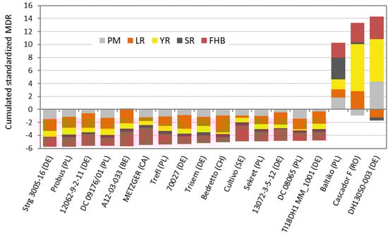 In our genotype panel, we selected the best genotypes that were multi-resistant to all diseases analyzed here (Figure 3). At least 15 genotypes had a standardized multi-disease resistance score below average for all five diseases simultaneously. They could not be assigned to a specific country or breeding program.
