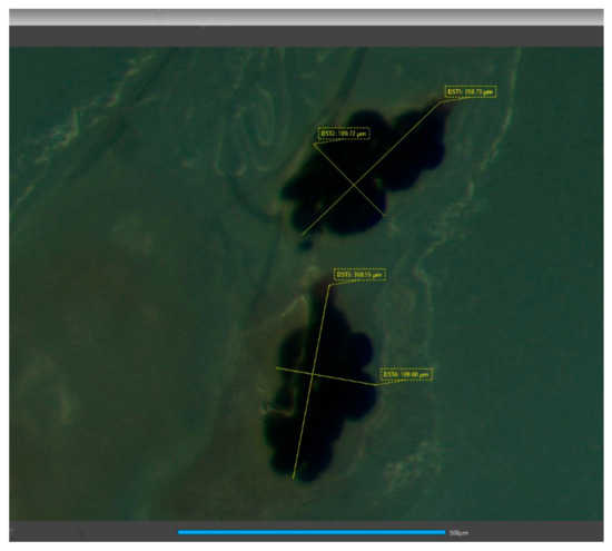 Spermathecae of wild females after mating with wild males. DST1 and DST2 correspond to the major and minor axis of the organ, respectively. Scale bar is equal to 500 μm. Photograph was taken with the camera Jenoptic Gryphax Naos and the measurements using its software (GRYPHAX version 2.1.0.724).