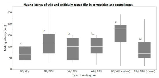 Boxplots of mating latency (min) of the pair combinations between wild and artificially reared flies in competition cages and in control cages. Different letters signify statistical difference (Tukey post-hoc test, α = 0.05).