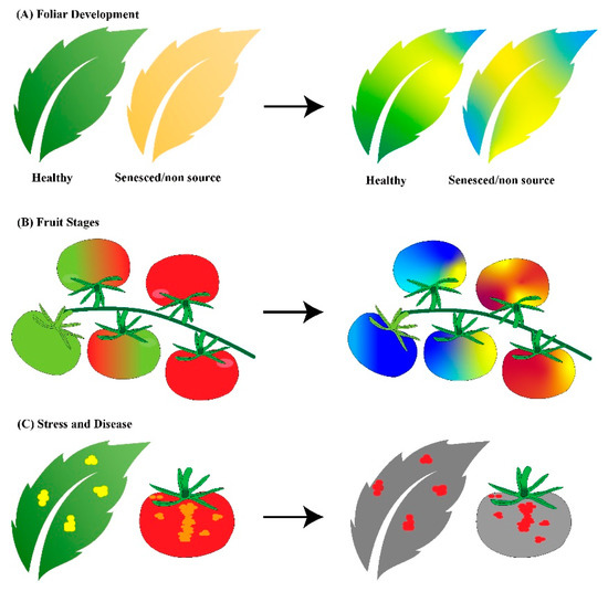 Demonstration of hyperspectral imagining applications. Hyperspectral imagining can be used to determine (A) foliar developmental stage, (B) fruit stage and ripening, and (C) stress and disease presence. The graphics on the left are an RGB color representation of what the human eye would see and the graphics on the right represent false color images after hyperspectral image processing.