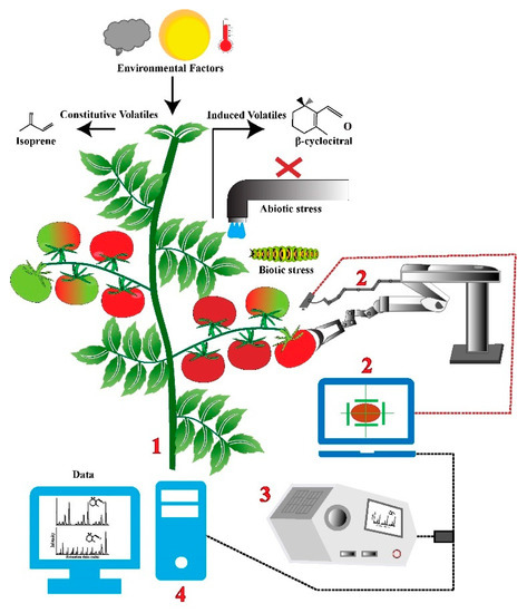 Plants emit a large array of volatile organic compounds (VOCs), which consist of various chemical classes, such as terpenes, fatty acid derivatives, alcohols, alkanes, alkenes, esters, isoprene, and acid. Plants emit these compounds from their flowers, fruits, leaves, and roots. Constitutive VOCs are those that are largely controlled by genetic and environmental conditions, and induced VOCs are those that are highly phenotypically plastic and affected by abiotic and biotic factors. Real-time VOC detection methods such as gas chromatography–mass spectrometry (GC–MS) and proton transfer reaction–mass spectrometry are starting to be used to investigate disease and pest presence on crops before visible indications are apparent [54]. Figure 4 demonstrates how, in the future, real-time measurement of VOC emissions from various plant organs could be performed by autonomous robots, while also executing crop harvests and maintenance tasks, such as pruning. These real-time measurements will help inform crop-management decisions that can be actioned before the abiotic or biotic stress is detrimental to crop health or negatively impacts yield. These methodologies can also be applied to fungal crop infections. Fungal infections impact crop production, and, for many infections, they are already widespread and difficult to treat by the time they are finally visible to the naked eye. By using continuous air-sampling techniques with optical sensors to detect the presence of spores, the detection of fungal infection can happen well before crop performance is impacted [45].