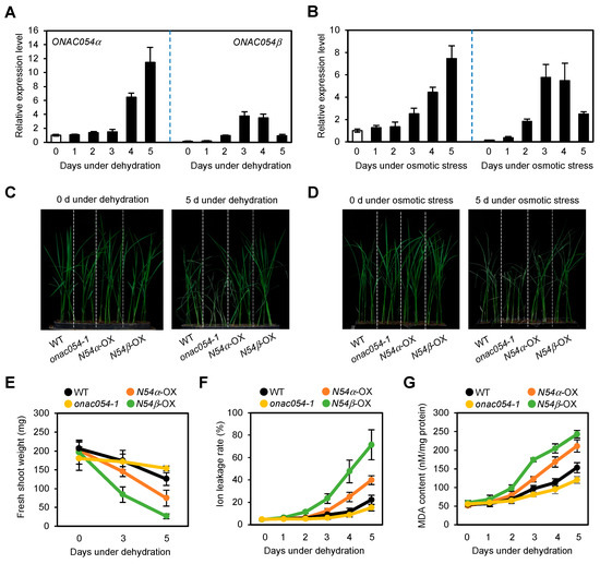 Next, we examined whether the onac054-KO mutant lines onac054-1 and ONAC054-OX lines (ONAC054α-OX and ONAC054β-OX), which were used in our previous study [31], were susceptible or tolerant to drought stress. Under normal growth conditions, the growth phenotype of onac054-1, ONAC054α-OX, and ONAC054β-OX seedlings was similar to that of the WT (Dongjin). However, after dehydration for 5 days, the onac054-1 seedlings exhibited severe wilting symptoms, whereas ONAC054α-OX and ONAC054β-OX seedlings exhibited strong drought tolerance compared with WT seedlings (Figure 1C). Similar susceptible and tolerant phenotypes of onac054-1 and ONAC054-OX seedlings, respectively, were also observed during the PEG treatment (Figure 1D). Consistent with the growth phenotype data, the fresh shoot weight of onac054-1 dramatically decreased, while ONAC054α-OX and ONAC054β-OX seedlings were unaffected by dehydration compared with the WT (Figure 1E). Furthermore, we measured the ion leakage rate and malondialdehyde (MDA) content, which are used as parameters of membrane damage caused by drought stress. Compared with the WT, the ion leakage rate and MDA content of osnac054-1 seedlings were dramatically higher, while those of ONAC054α-OX and ONAC054β-OX seedlings were much lower under dehydration stress (Figure 1F,G), indicating that the cell membrane of osnac054-1 seedlings was highly unstable. The dehydration susceptible phenotype of the onac054-KO mutant was also confirmed in onac054-2. Similar to onac054-1, the onac054-2 mutant showed a significantly higher ion leakage rate and a faster decline in fresh shoot weight than the WT (Figure S1). To evaluate the effects of the KO mutation and overexpression of ONAC054 on drought stress tolerance, we determined the survival rate of onac054-1 and ONAC054-OX seedlings after 3 days of rehydration. While most of the onac054-1 seedlings failed to recover, the ONAC054α-OX and ONAC054β-OX seedlings showed a significantly higher survival rate than WT seedlings (Figure S2). Taken together, these results suggest that both ONAC054 isoforms act as enhancers of drought stress tolerance in rice.