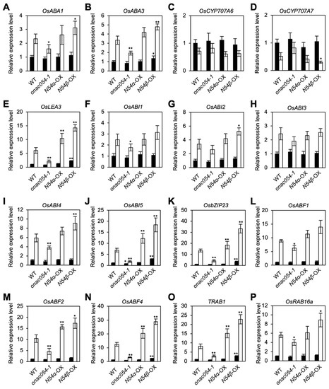 Effects of the KO mutation and overexpression of ONAC054 on the transcript levels of genes associated with ABA metabolism and signaling. (A–P) Transcript levels of genes associated with ABA metabolism, including OsABA1 (A), OsABI3 (B), OsCYP707A6 (C), and OsCYP707A7 (D), and with ABA signaling, including OsLEA3 (E), OsABI1 (F), OsABI2 (G), OsABI3 (H), OsABI4 (I), OsABI5 (J), OsbZIP23 (K), OsABF1 (L), OsABF2 (M), OsABF4 (N), TRAB1 (O), and OsRAB16a (P), in Dongjin (WT), onac054-1, ONAC054α-OX (N54α-OX), and ONAC054β-OX (N54β-OX) seedlings before (white bars) and after 4 days of dehydration (black bars). The transcript level of each gene was normalized first against that of OsUBQ5, and then against the value obtained in WT seedlings before dehydration. Data represent the mean ± SD of four biological replicates. Asterisks (* p < 0.05; ** p < 0.01) indicate significant differences identified between the WT and other genotypes by Student’s t-test.