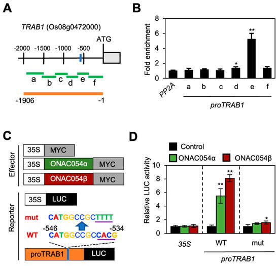 ONAC054 directly activates TRAB1 expression. (A) Structure of the TRAB1 promoter. Regions amplified in the ChIP assay and used for the protoplast co-transfection assay are indicated using green and orange horizontal bars, respectively. The MDM variant is indicated by a blue vertical bar. (B) Analysis of the binding of ONAC054 (ONAC054β) to the TRAB1 promoter in planta using the ChIP assay. GFP-ONAC054β was transiently expressed in protoplasts isolated from 10-day-old WT seedlings. Fold enrichment of promoter fragments was measured by immunoprecipitation with an anti-GFP antibody (see Materials and Methods). Enrichment of the promoter region of an unrelated gene, PP2A, served as a negative control. Asterisks above each bar indicate significant differences between PP2A and other samples (* p < 0.05; ** p < 0.01; Student’s t-test). (C) Effector and reporter constructs were used to perform the protoplast transient expression assay. Each construct also contained the NOS terminator (not shown). (D) Activation of WT and mutant versions of the TRAB1 promoter (proTRAB1; −1906 to −1 bp, relative to the translation start site) by ONAC054α and ONAC054β in protoplasts. The 35S promoter and empty expression vector (35S:MYC) served as negative controls. Asterisks indicate significant differences compared with the 35S:MYC samples (* p < 0.05; ** p < 0.01; Student’s t-test). Data in (B,D) represent the mean ± SD of four reaction mixtures.