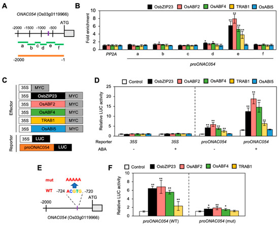 ABF transcription factors directly activate ONAC054. (A) Structure of the ONAC054 promoter. Regions amplified in the ChIP assay (regions a, b, c, d, e, and f) and used for the protoplast co-transfection assay are indicated using green and orange horizontal bars, respectively. The ABRE motif is indicated by a purple vertical bar. (B) Analysis of the binding of OsbZIP23, OsABF2, OsABF4, TRAB1, and OsABI5 to ONAC054 promoter in planta using ChIP assay. OsbZIP23-MYC, OsABF2-MYC, OsABF4-MYC, TRAB1-MYC, and OsABI5-MYC were transiently expressed in protoplasts isolated from 10-day-old WT seedlings. Fold enrichment of promoter fragments was measured by immunoprecipitation with an anti-MYC antibody (see Materials and Methods). Enrichment of the promoter region of an unrelated gene, PP2A, served as a negative control. Asterisks above each bar indicate significant differences between PP2A and other promoter fragments of ONAC054 (* p < 0.05; ** p < 0.01; Student’s t-test). (C) Effector and reporter constructs are used in the protoplast transient expression assay. Each construct also contained the NOS terminator (not shown). (D) Activation of the ONAC054 promoter (−2000 to −1 bp, relative to the translation start site) by OsbZIP23, OsABF2, OsABF4, TRAB1, and OsABI5 in protoplasts treated with or without 10 μM ABA. The 35S promoter and empty expression vector (35S:MYC) served as negative controls. Asterisks indicate significant differences compared with 35S:MYC samples (** p < 0.01; Student’s t-test). (E) Structure of a mutated ONAC054 promoter. In proNAC054 (mut), the ABRE motif ACGTG (−724 to −1 bp, relative to the translation start site) was changed to AAAAA. (F) Activation of WT and mutated ONAC054 promoters by OsbZIP23, OsABF2, OsABF4, and TRAB1 in protoplasts. Asterisks indicate significant differences compared with 35S:MYC samples (* p < 0.05; ** p < 0.01; Student’s t-test). Data in (B,D,F) represent the mean ± SD values of four biological replicates.
