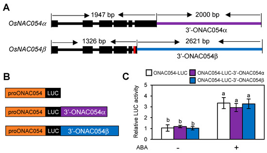 The 3′-UTRs of ONAC054α and ONAC054β do not affect their expression patterns. (A) Gene structure of ONAC054α and ONAC054β. The insertion of 7 bp in the fifth intron of ONAC054β created an alternative 3′ splice site and a premature stop codon, leading to a difference in the length of the 3′-UTRs of ONAC054α (purple horizontal bar) and ONAC054β (blue horizontal bar). (B) Reporter constructs are used in the protoplast transient expression assay. (C) Effects of 3′-flanking sequences of ONAC054α and ONAC054β on the activity of the ONAC054 promoter (−2000 to −1 bp, relative to the translation initiation site) in protoplasts treated with or without ABA. Data represent the mean ± SD of four biological replicates, and different lowercase letters indicate significant differences (p < 0.05; Tukey’s multiple comparison test).