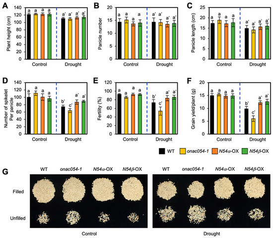 Agronomic traits of onac054-1 and ONAC054-OX plants under drought stress conditions. (A–F) Agronomic traits, including plant height (A), panicle number per plant (B), panicle length (C), spikelet number per panicle (D), seed fertility (E), and grain yield per plant (F), of WT, onac054-1, ONAC054α-OX (N054α-OX), and ONAC054β-OX (N054β-OX) plants grown under normal growth conditions or drought stress conditions (see Materials and Methods). Data represent the mean ± SD (n = 6 plants), and different lowercase letters (letters with ’ for drought stress conditions) indicate significant differences (p < 0.05; Tukey’s multiple comparison test). (G) Relative abundance of fertile and sterile spikelets in different genotypes.