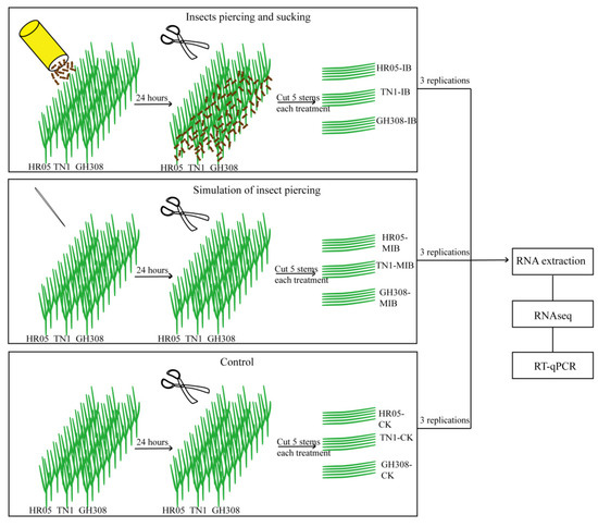 The 9 basins of seedlings were divided into three groups—two treatments and one control,—and set up as follows: In group 1, for each basin, 300 BPH nymphs (3rd–4th instar) were released and allowed to freely move and feed on the 30 seedlings for the next 24 h. Then, five stems of each rice cultivar were cut, put into three cryo tubes and quickly stored in a −80 °C refrigerator. The tubes were labeled GH308-IB, HR05-IB, and TN1-IB. In group 2, the stems of each seedling were pricked 10 times randomly every hour for 24 h, as a simulation of insect piercing, and then five stems of each rice cultivar were cut, put into three cryo tubes, and quickly stored in a −80 °C refrigerator (labeled GH308-MIB, HR05-MIB, and TN1-MIB). In group 3, the last three basins were not subjected to any treatment and were designated as controls. After 24 h, the stems were collected as described above (labeled GH308-CK, HR05-CK, and TN1-CK) (Figure 1).