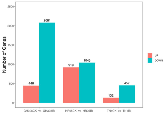To investigate the difference between BPH-damaged rice samples and control samples (CKs) without any treatment, DEGs were identified by comparing BPH-damaged rice samples to control samples (CKs) without any treatment. In GH308, 2527 genes were differentially expressed in BPH-damaged samples compared to CK, of which 446 genes were up-regulated and 2081 genes were down-regulated. In HR05, 1962 genes were differentially expressed, of which 919 were up-regulated and 1043 were down-regulated. In addition, 584 genes showed differential expression in TN1, of which 132 were up-regulated and 452 were down-regulated (Figure 3). Then, we performed KEGG analysis on the DEGs of the three rice cultivars. It was shown that BPH-damaged rice samples had many significantly differentially expressed genes, and the differences in the number of varied genes were also significantly different among the three rice cultivars (Tables S2–S4).